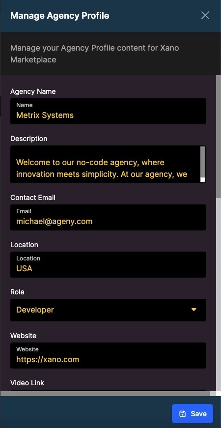 After clicking save your Agency Profile will be submitted for review. Please allow up to a few days for your profile to be reviewed by the Xano team.Once approved your profile will automatically appear on the Xano Marketplace Partner Directory and leads can start contacting you.