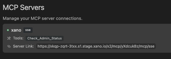 Paste your server URL in the Server URL section. You can retrieve your server URL by navigating to your server in Xano and clicking Copy Connection URL.You should now see your MCP Server ready in Cursor