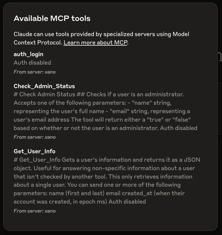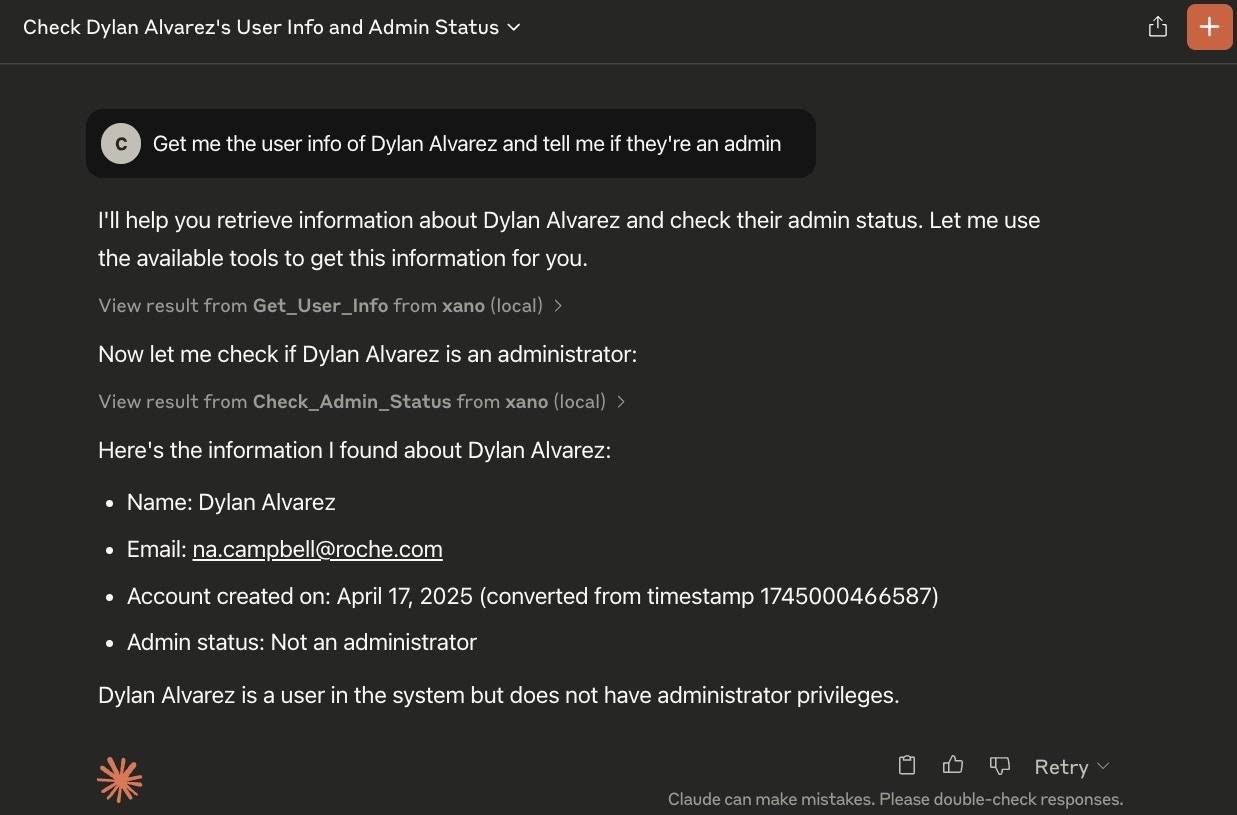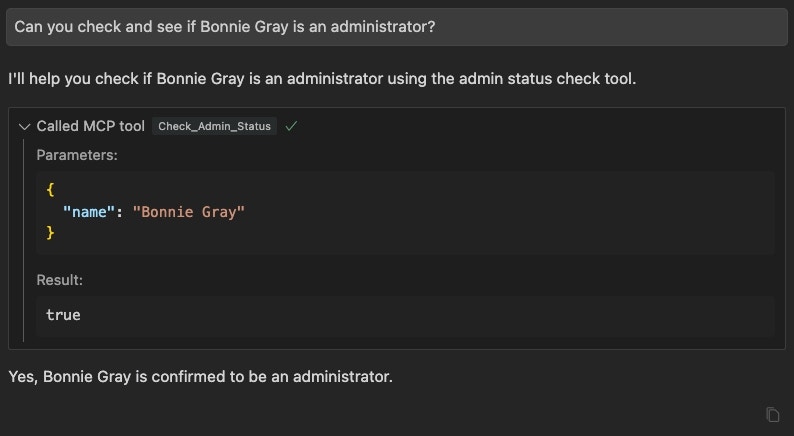 Once you’re connected following the instructions above, you should be able to converse with the AI like you would any other, asking real-world questions that the tools you built should be able to answer. For example, if we have a tool that just returns a true or false, we’d probably be asking yes or no questions, such as “Does this user, john@email.com, have administrator access?”