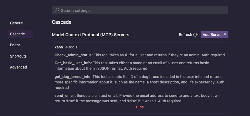 The below instructions will allow you to connect your Xano MCP server to Cursor and make them available across any project. The below method does not support authentication. If you need authentication or want to define per-project MCPs, use these instructions instead.Open your Cursor settings
