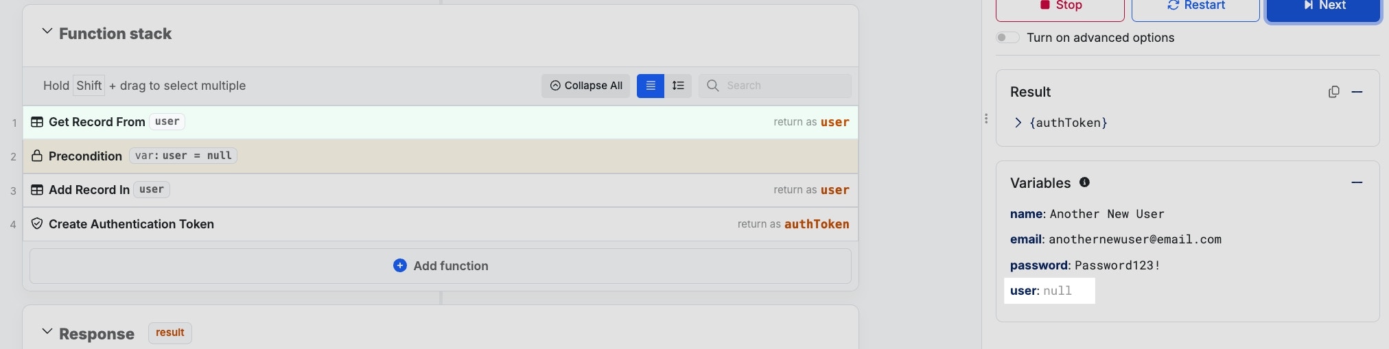 Click Turn On Advanced Options to enable the advanced debugging options.- Step Over - When working with nested function stacks (custom functions or middleware), if you don’t need to debug those, just step right over them and continue with the next function in your function stack
