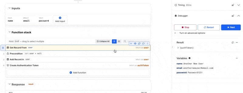 Run it again by clicking Run Again , reset everything back to the initial state by clicking Reset , or activate the debugger with Activate Debugger .You can also use this opportunity to define sample inputs and responses for your Swagger (OpenAPI Documentation).When testing your function stacks in Xano, you can define sample input and output examples for your Swagger documentation.It is important that you do this to ensure that your documentation is as effective as possible, as well as for helping AI models understand what’s expected when interacting with your APIs.