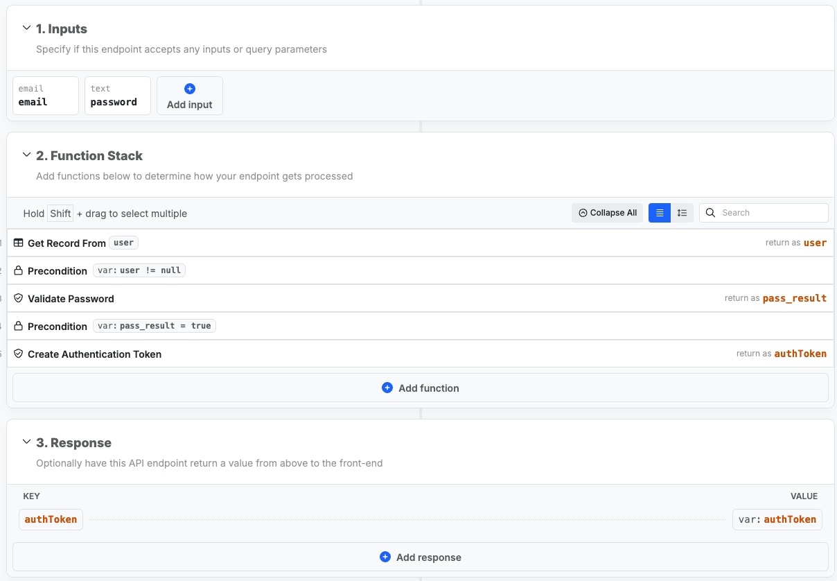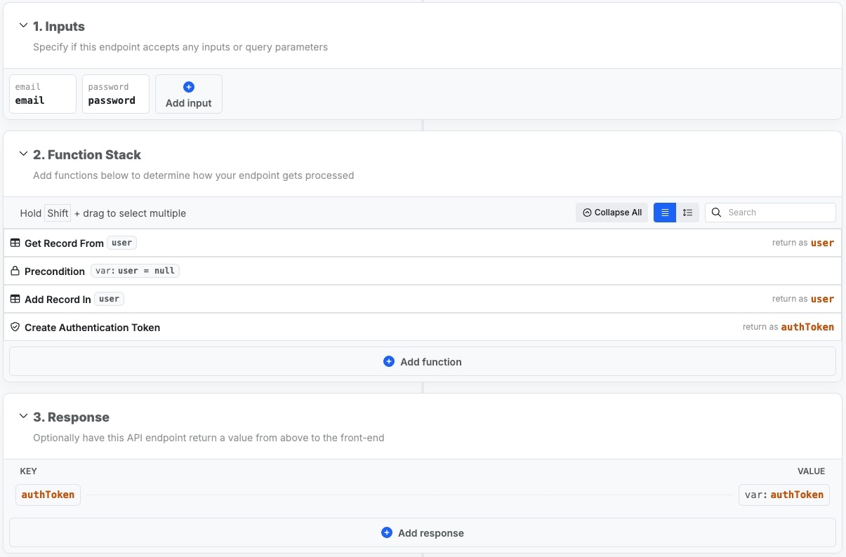 Below, you can review a typical login and signup flow — you are free to modify them to suit your needs. These are the same that Xano can add for you during signupLogin
