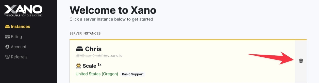 Direct Database Connector is available as a paid add-on. Please visit your Billing page to add this to your plan. Database Connector is a premium add-on that is available for Launch and Scale plans. Please visit your Billing page for the most up-to-date pricing for this additional feature. You have the option to connect your Xano instance’s PostgreSQL database directly with an external application or service. This can be useful if there is a platform for manipulating your database that you prefer to use over the Xano interface, creating custom backup and restore solutions, or even performing data analytics. Use care when accessing your database directly. This type of connection removes a significant portion of normal checks and balances for data validity that using Xano directly provides. Proceed with caution. How to Access the Database Connector On your instance selection screen, click the ⚙️ icon, and in the panel that opens, choose Database Connector.