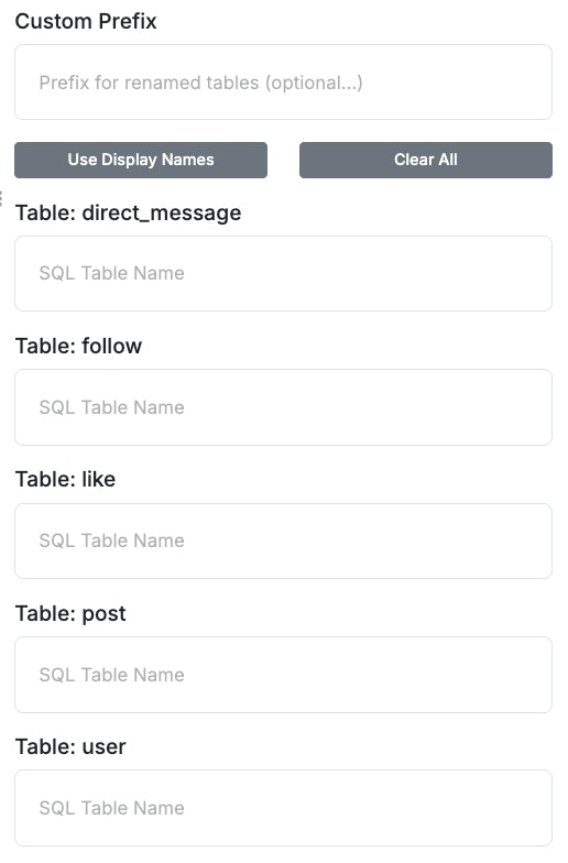 - Leave the SQL Table Name field blank to use Xano’s default SQL table name, which follows the format mvpw<workspaceID>_<tableID> (e.g., mvpw1_3).