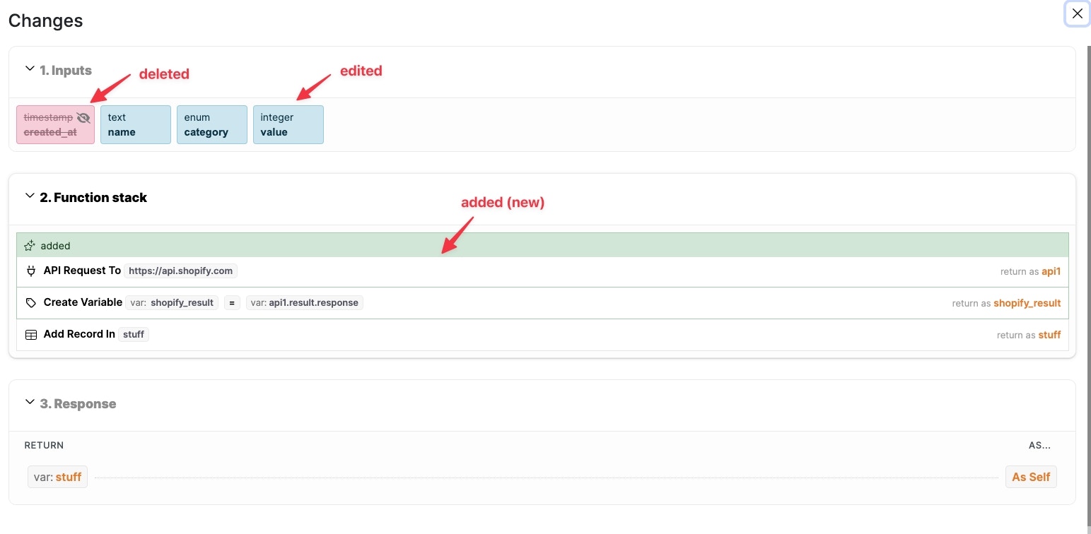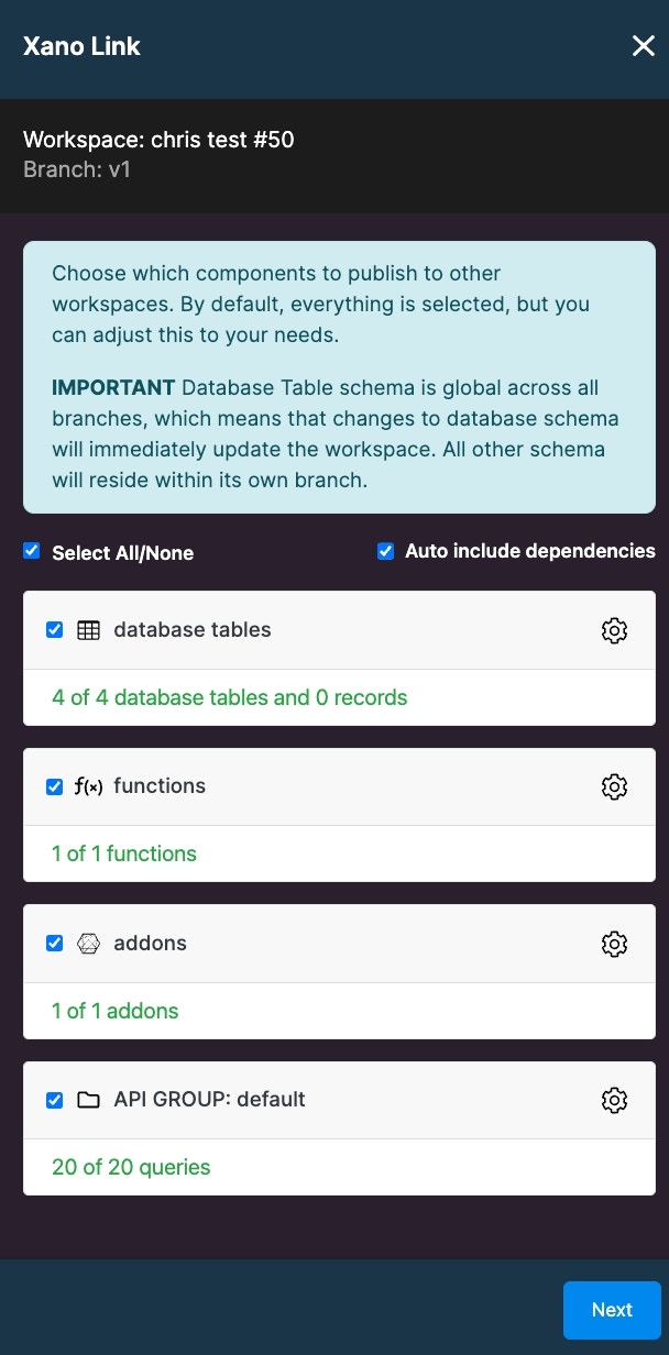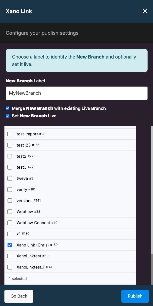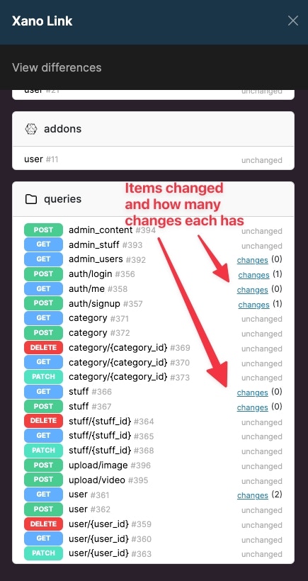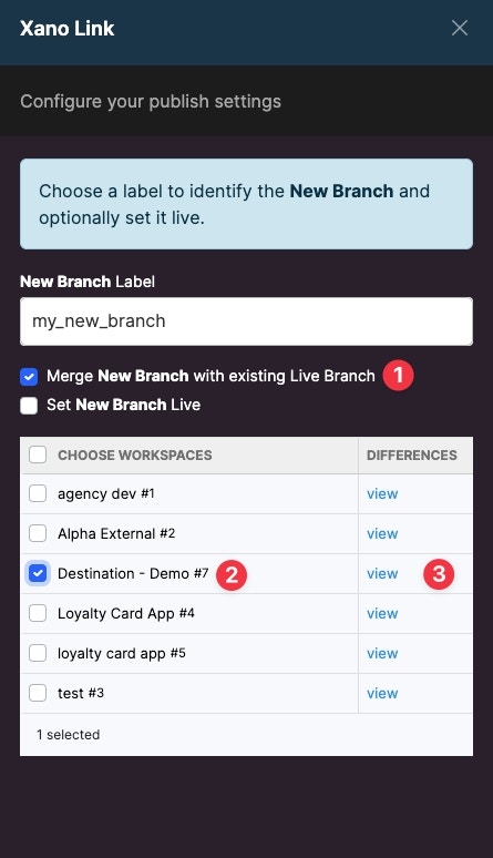 Xano Link allows you to view and compare differences before merging a branch from the source workspace into a branch from the destination workspace. Be sure to select the Merge New Branch option and the destination workspace before selecting “view.