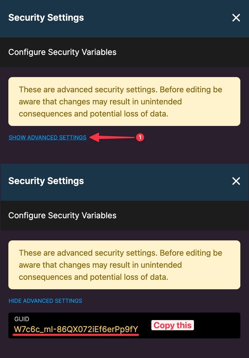 - Click “Show Advanced Settings” and copy the GUID that is shown in the box.