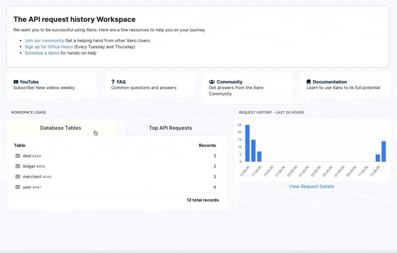 From the dashboard, easily view the high-level statistics of the API request history from your entire Workspace. You can toggle between your database and top API requests to see which of your API endpoints are being hit the most. To the right, visualize your API request history with a graph displaying the statistics of the past 24 hours. Select ‘View Request Details’ to see a detailed view and history of each API call made in your Workspace. You can expand each individual call to review detailed information including inputs, response and request headers, and the output. You can even drill-down on a per-user basis to see the activity of each user in your application. Furthermore, you can view failed API calls here in order to help debug what went wrong. Finally, you can use these details to understand Webhook payloads to make it easier to build API endpoints that receive Webhooks.