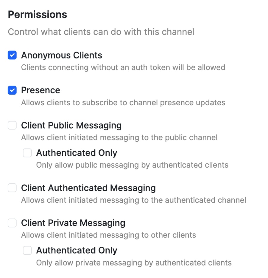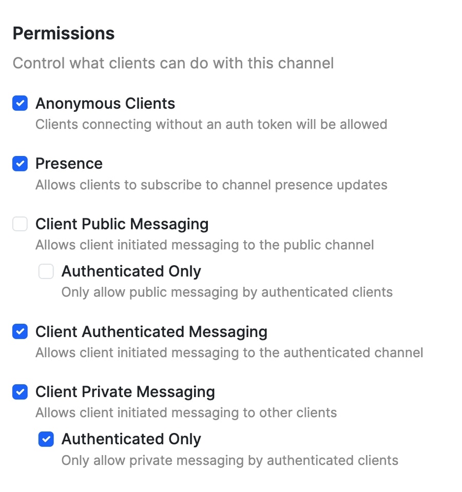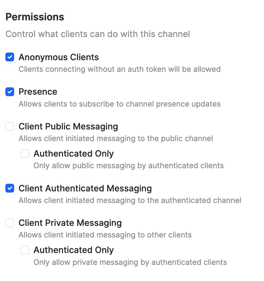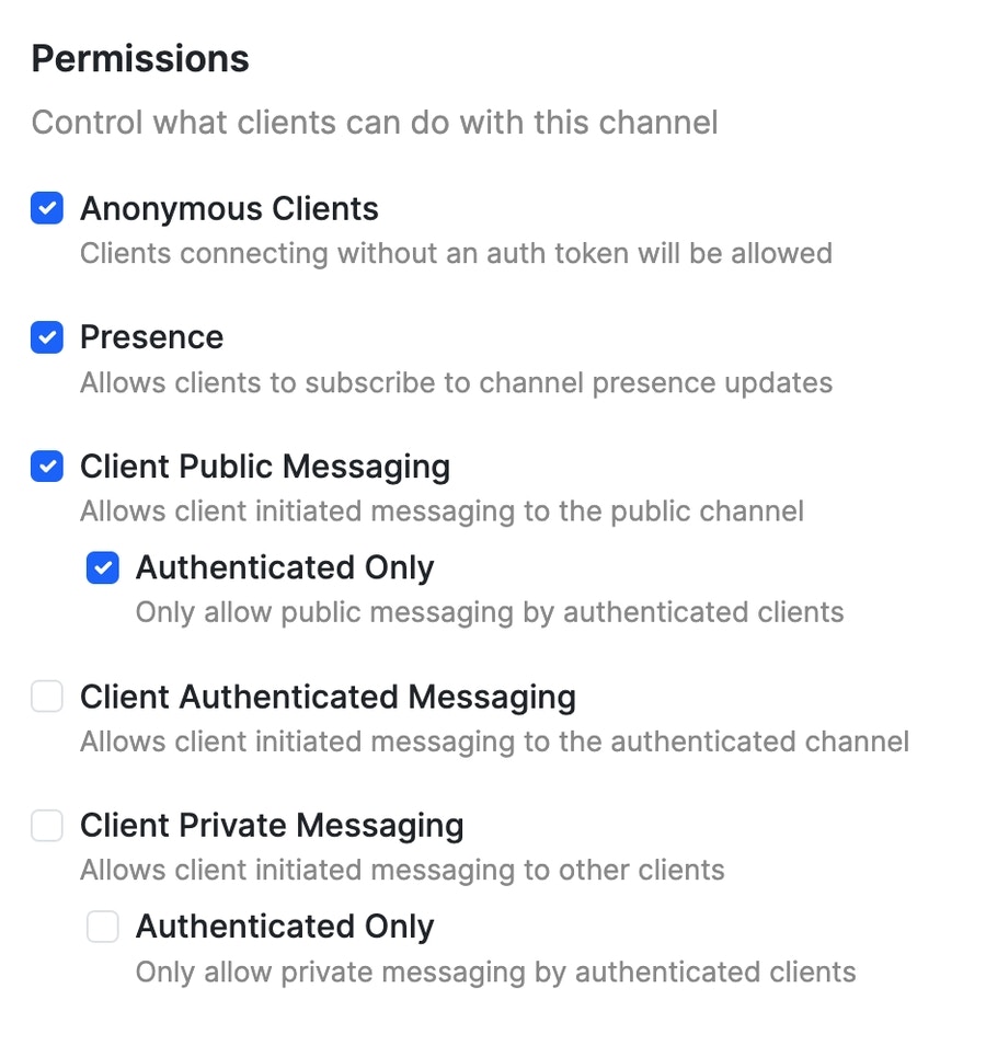 This option allows authenticated and unauthenticated clients to send messages to the channel. These messages will be sent to all the users connected to the channel.Similar to Client Public Messaging, this permission allows only authenticated users to send messages to the channel. Unauthenticated clients can still see the messages being sent to the channel.