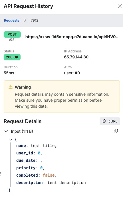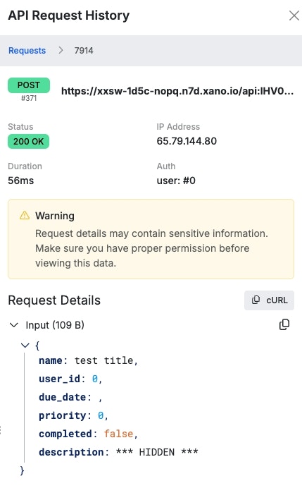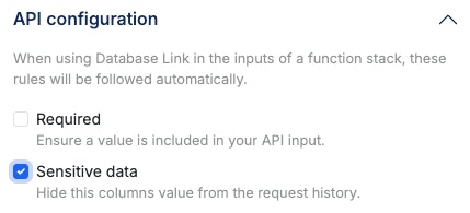 Xano maintains a request history of incoming requests of your APIs. To ensure that no sensitive data is not logged in the request history, you can enable the Sensitive Data flag on that database field to ensure it is not stored.The sensitive data flag only impacts the inputs of a request when using database link, which automatically creates inputs for you based on database fields; you will want to ensure that the sensitive data is not returned elsewhere in your function stack.