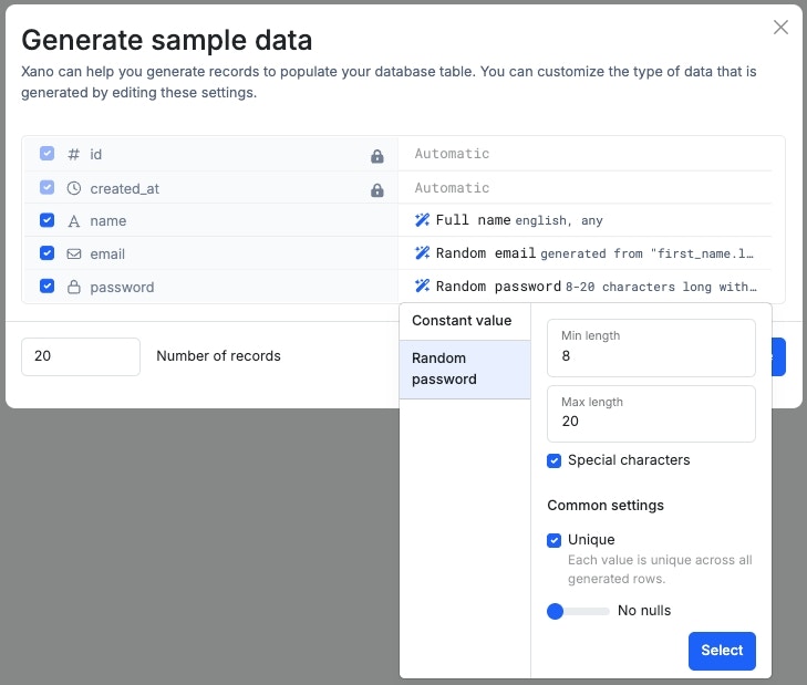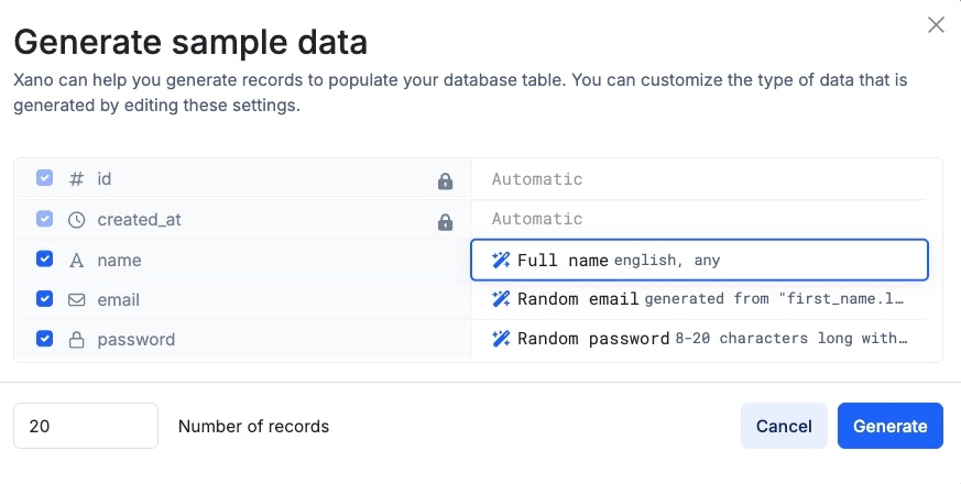Xano can provide you with some standard pre-built APIs for basic operations against this table. If you choose this option, you’ll also want to supply an API Group for those endpoints to live in. You can always choose to generate these endpoints later, too.