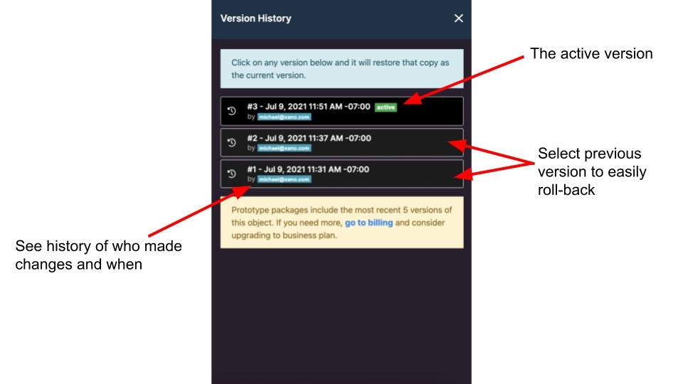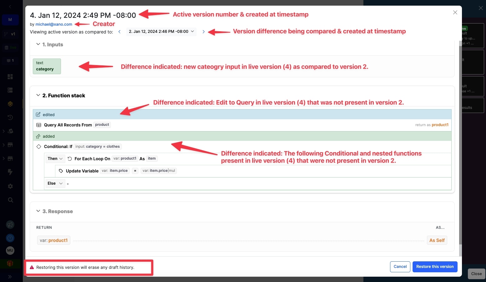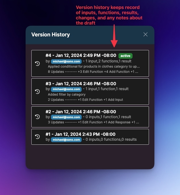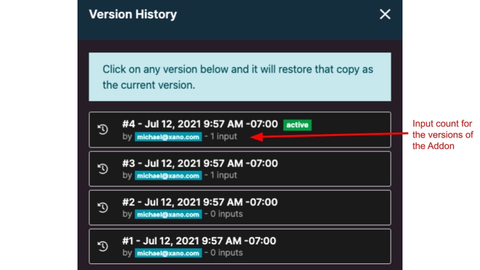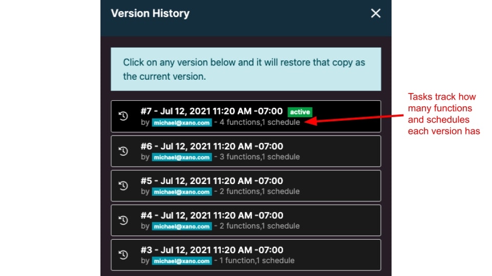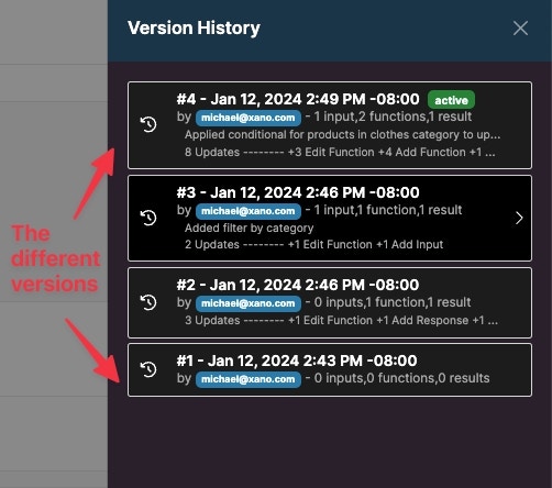 Counts of each versions' inputs, functions, and results allow you to determine which version you may wish to roll-back to.
