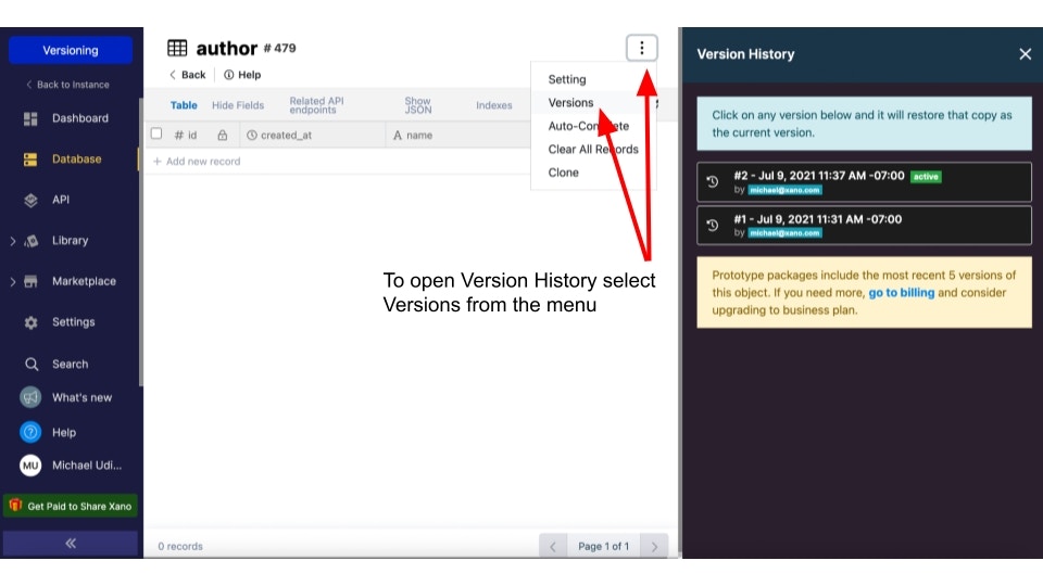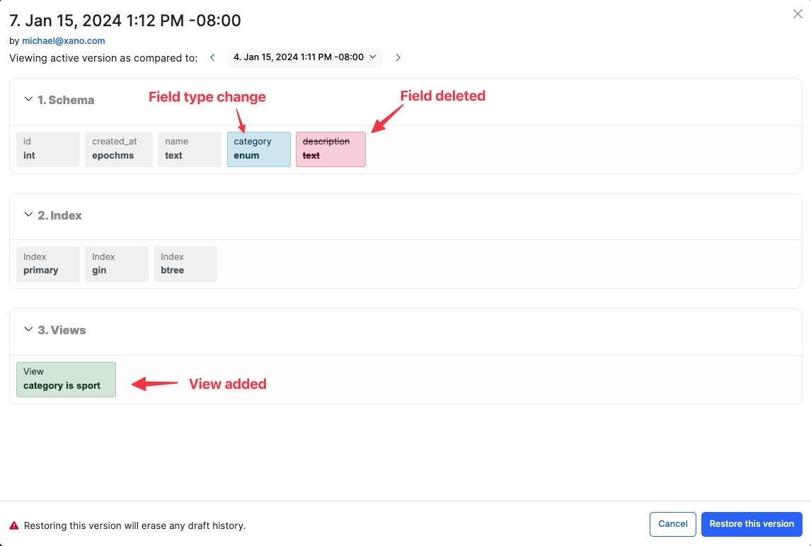 Difference comparison in schema versioning is also available on the database. In addition to information about the version number, created at time, and creator. Difference comparison on the database will include differences in:- Schema (columns)