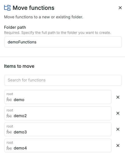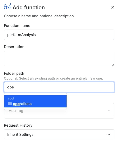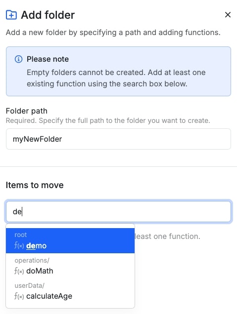 When creating a new function, you’ll be given the option to store it in a folder.Just start typing the name of the folder. If it exists, select it from the auto-complete dropdown. If it doesn’t exist, it will be created for you.