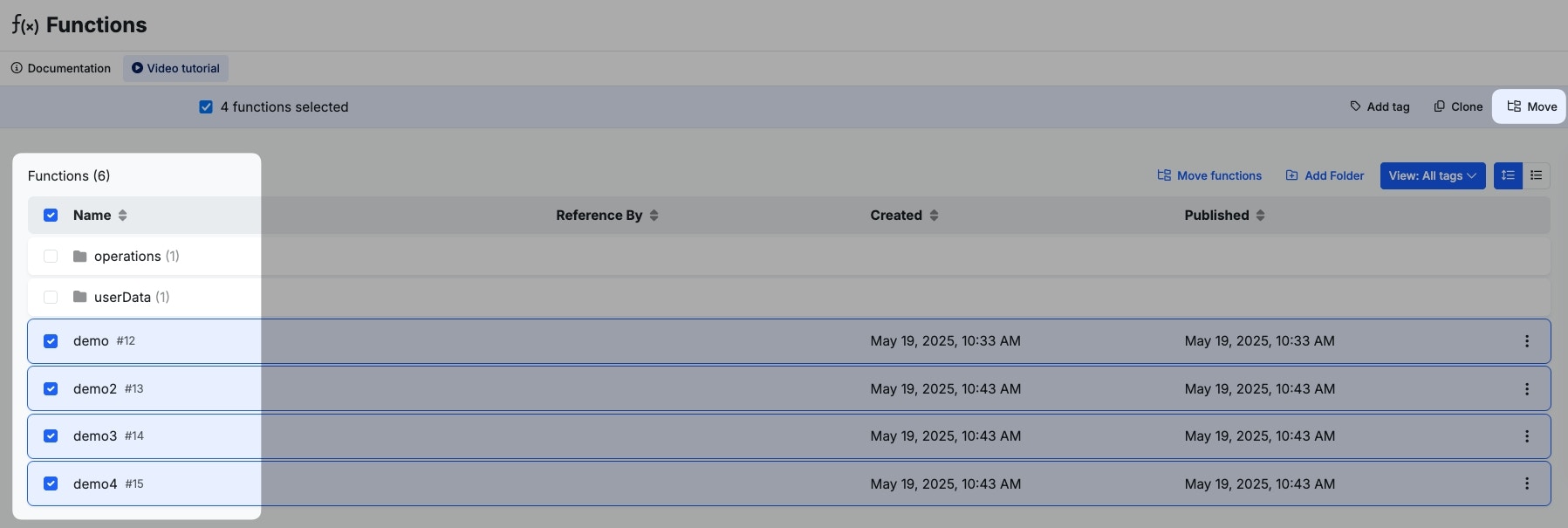 Select the functions to move by using the checkboxes on the left-hand side, and click Move