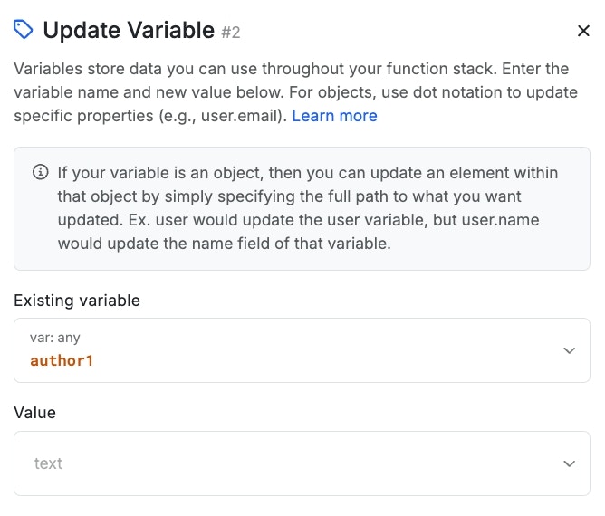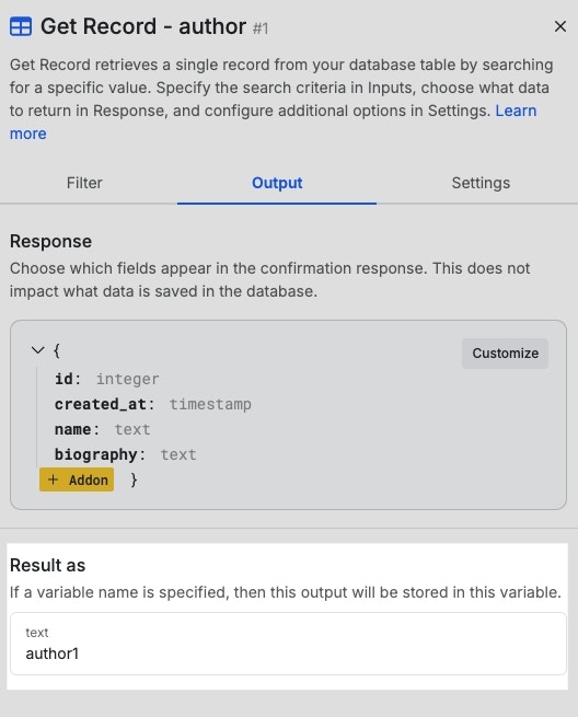Most functions that you can add to a function stack will have some kind of output available. The output of these functions are stored in a variable. In the screenshot shown below, we are using a get record function to retrieve a record from ourauthor