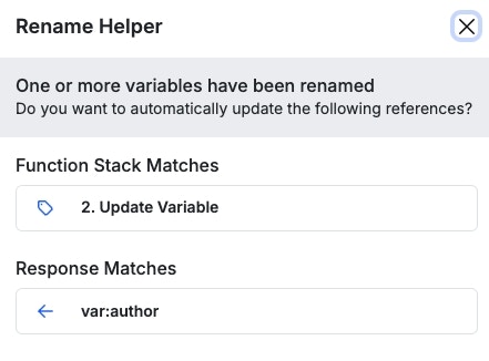 As you build your function stacks, you’ll want to ensure you are naming variables appropriately, so you can understand what they contain. When adding a function, you’ll usually have the option to set the variable name.