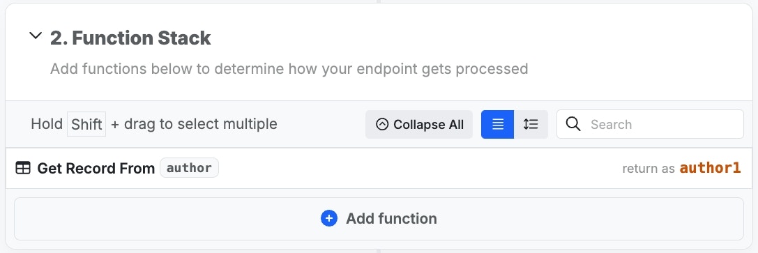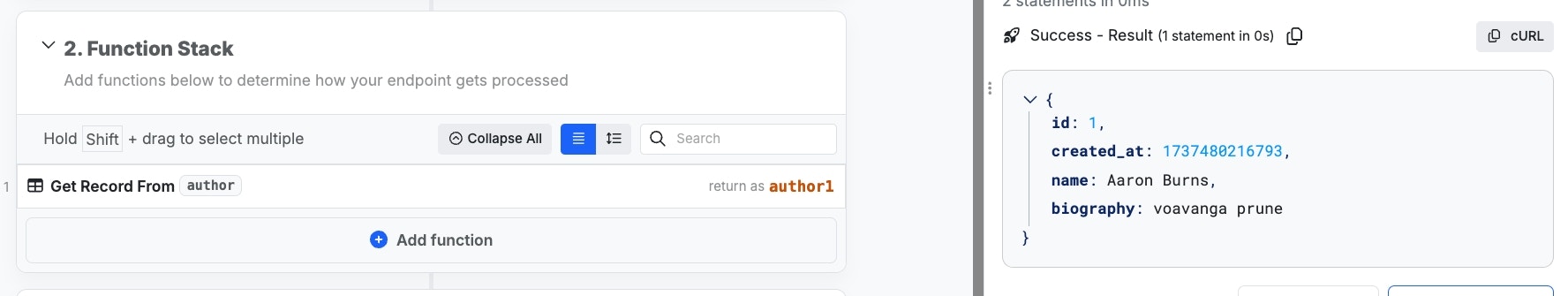 table. On the right side of that function, take note of return as author1. This is the variable that the record we retrieve is stored in, and what we will use to get that data in subsequent functions.