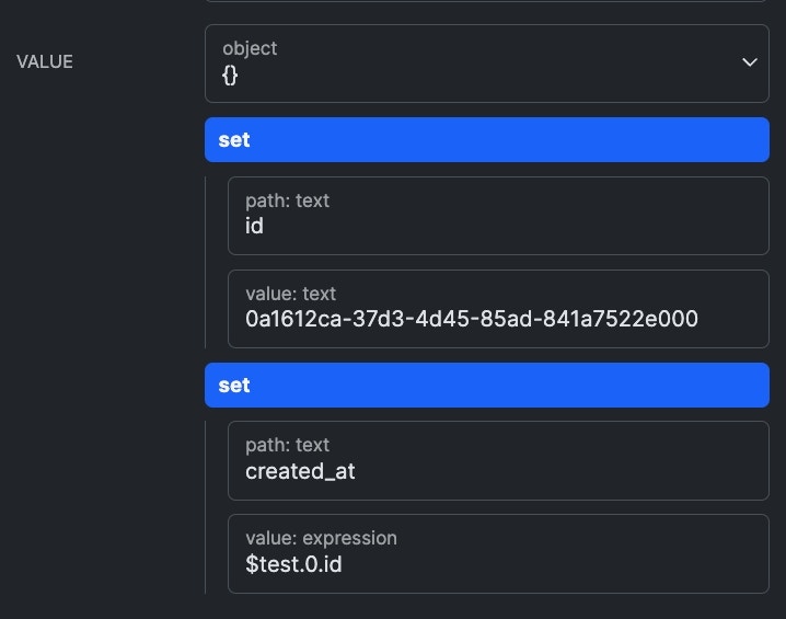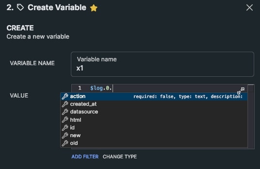 When building expressions, you’ll see autocomplete suggestions as you type. This works for variables, inputs, and environment variables, as well as filters. For variables with nested data, such as objects, you’ll also be presented with an auto-complete of the fields inside of that object. In this example, we’re targeting a variable calledlog
