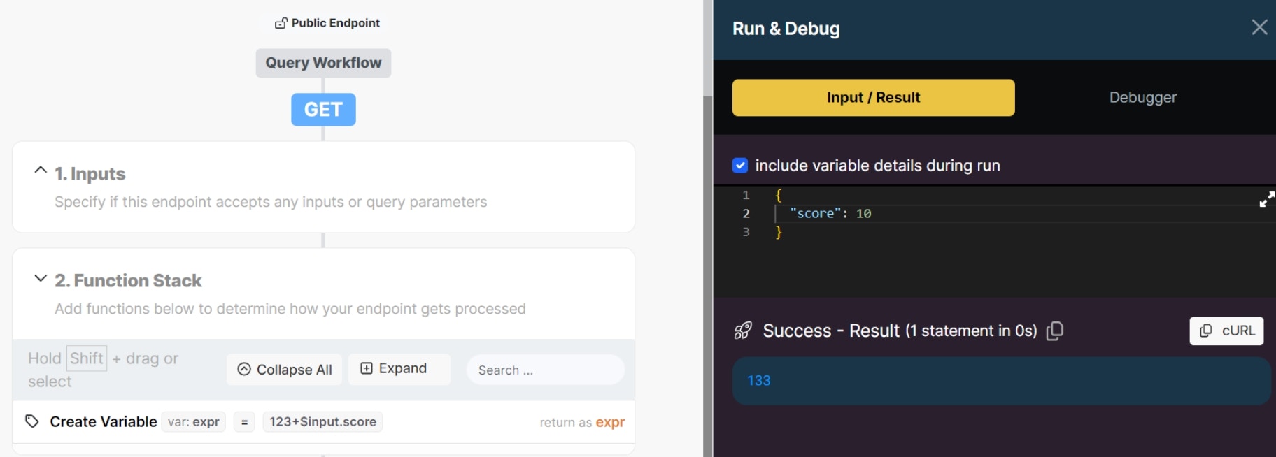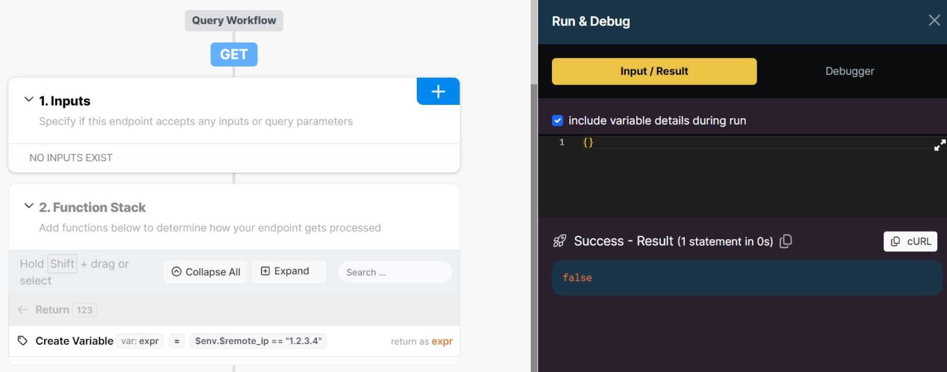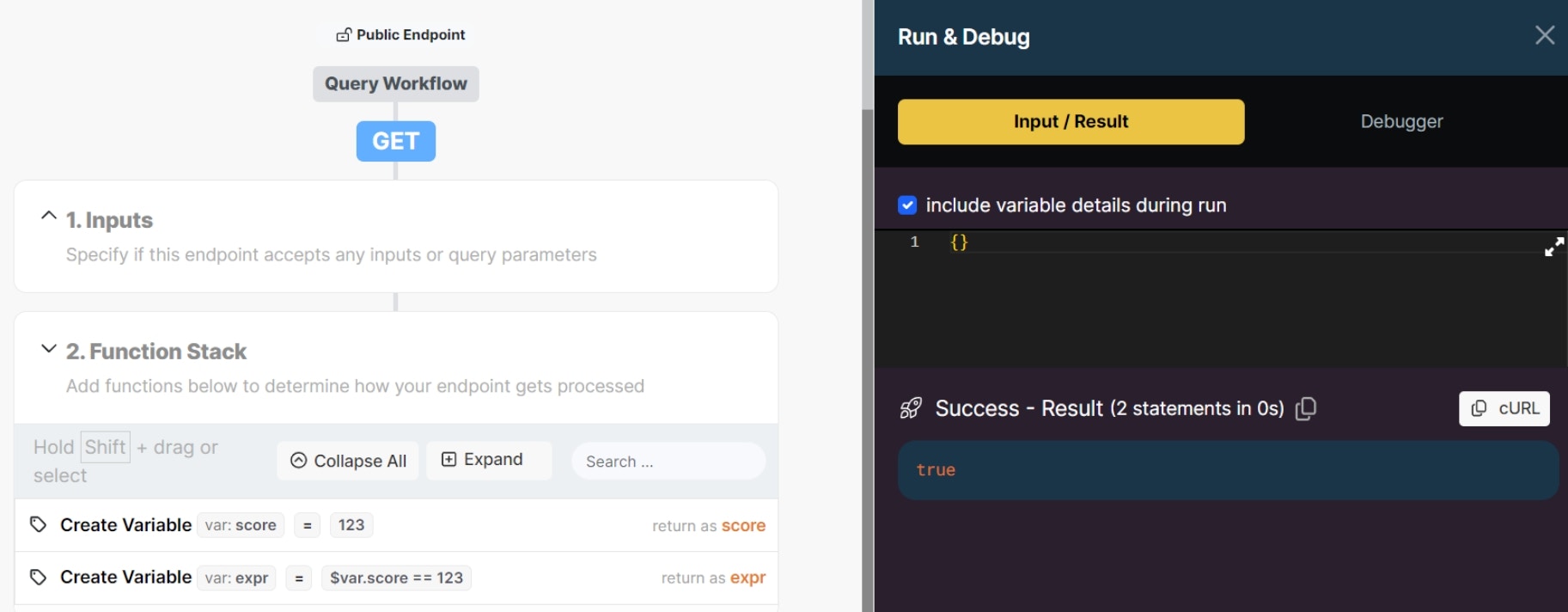 When using the Expression data type, you will be presented with an Expression Editor & Playground to enable easier editing and testing of your expression.To get the most value out of the expression editor and playground, make sure to add any variable contents you’d like to use in the Context panel, and make sure to Run & Debug your function stack to enable auto-complete.