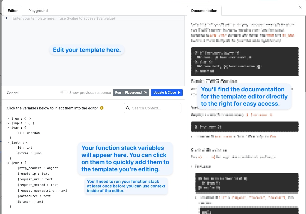 Once you add the Template Engine to your function stack, click the ✏️ button in the panel to open the editor, or use the AI assistant to help write a template for you