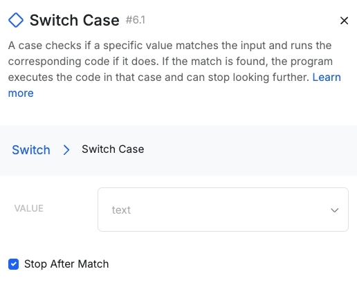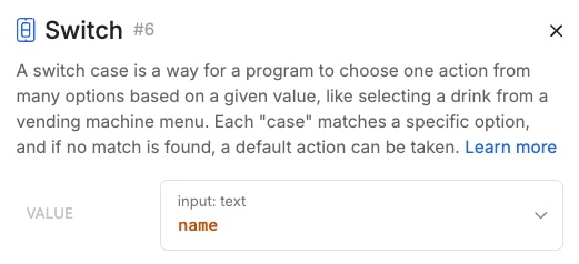 Quick SummarySwitch Case is similar to a conditional statement, but it’s designed to only check a single value for matches. Where a conditional is great for things like “If the user joined before 2020 and is also a subscriber”, Switch Case is more efficient and ideal for simple scenarios like “If the color is red, blue, green, brown, yellow, or orange”, when you want each of those options to have different paths.