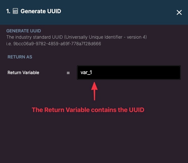 Generate a globally unique identifier. The industry standard UUID (Universally Unique Identifier - version 4) i.e. 9bcc06a9-9782-4859-a69f-778a7f28d666