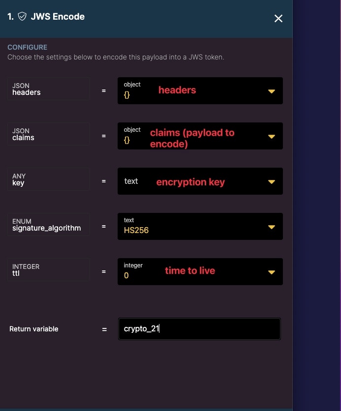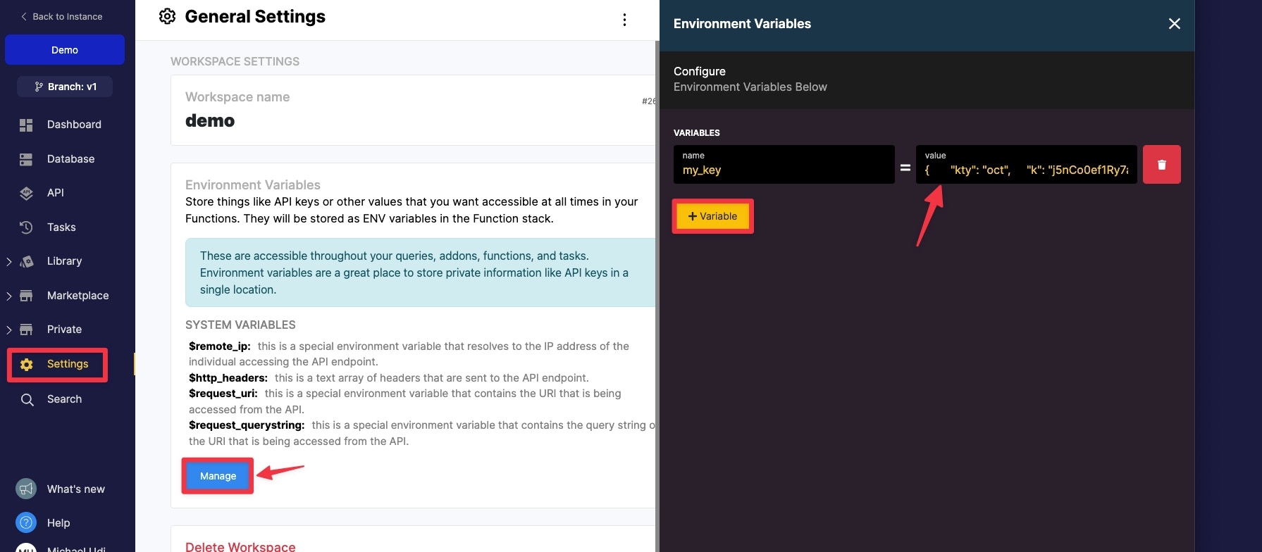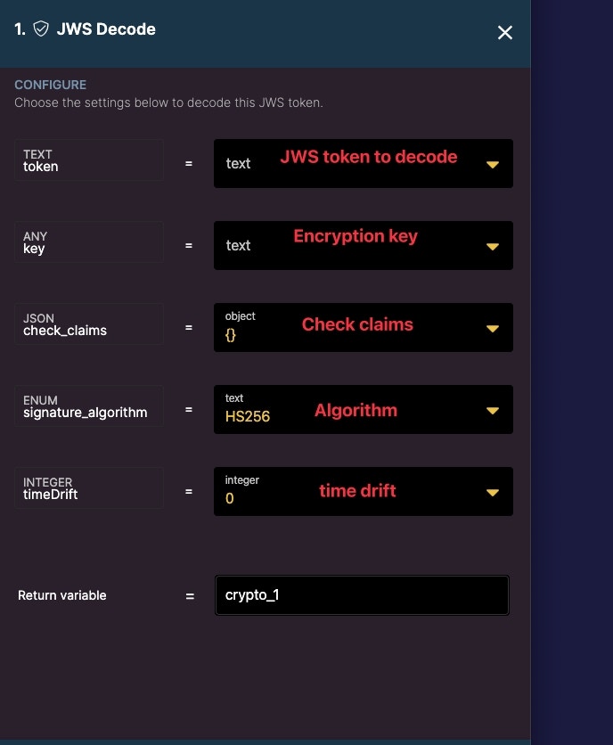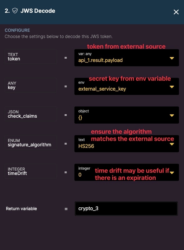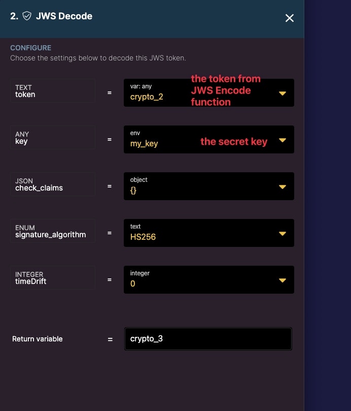 Sometimes you may be using a service that requires you to decode or decrypt a JWS token. Like the above example, it is recommended that you store the key in an environment variable for safe keeping and so that you may call it wherever you may need it in your workspace.