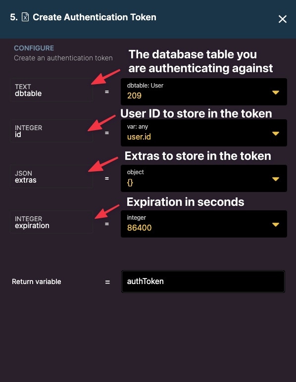Create a Token used for Authentication. Authentication is an important concept in app building, you can read more about it here.- dbtable: Refers to a database table that has authentication enabled. Select the table you wish to authenticate against