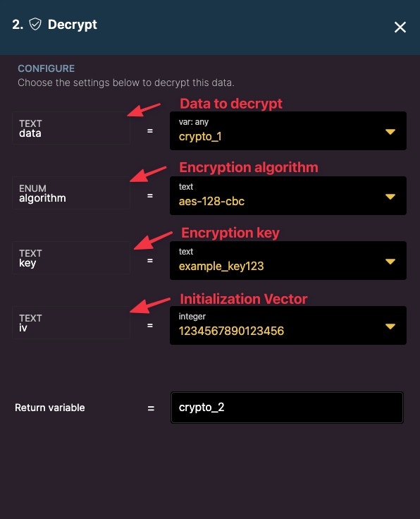 - IV - This is either 16 or 12 characters depending on your algorithm (cbc requires 16 characters and gcm requires 12). This information should be kept hidden in an env variable. If you are sending encrypted data to someone, then they would need to know this.