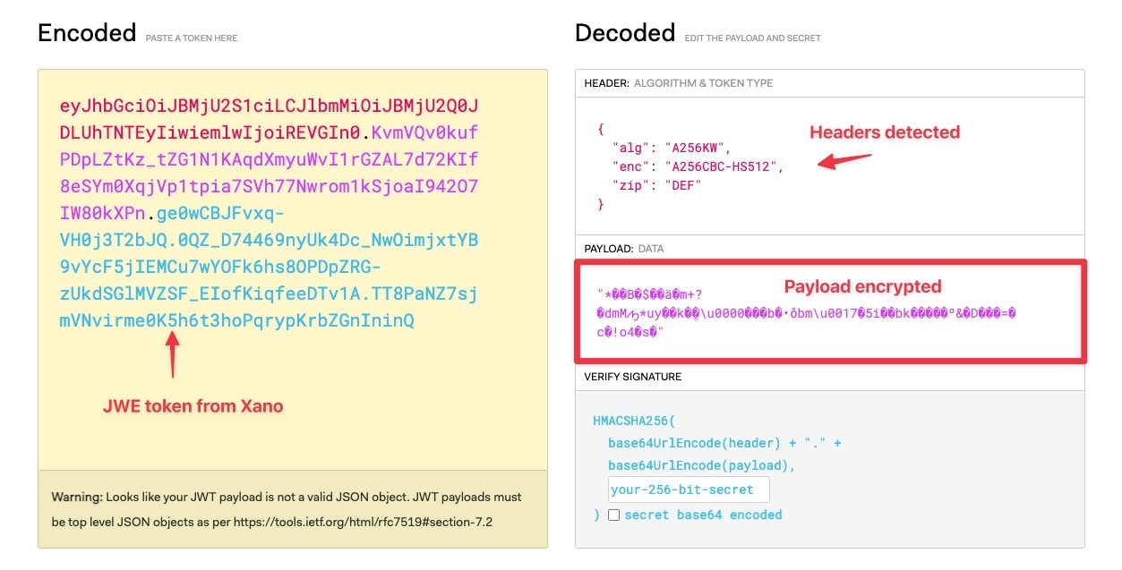 The main difference between JWE and JWS is one is able to be seen but not tampered with and the other is encrypted and not tampered with. JWS is able to be seen (with the right decryption) but not tampered. JWE is encrypted and not tampered with. Example using JWT.IO We can use jwt.io to see an example of the difference between JWE and JWS. First let’s encode a JWE token.