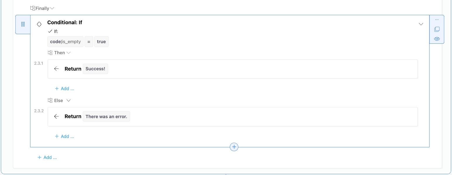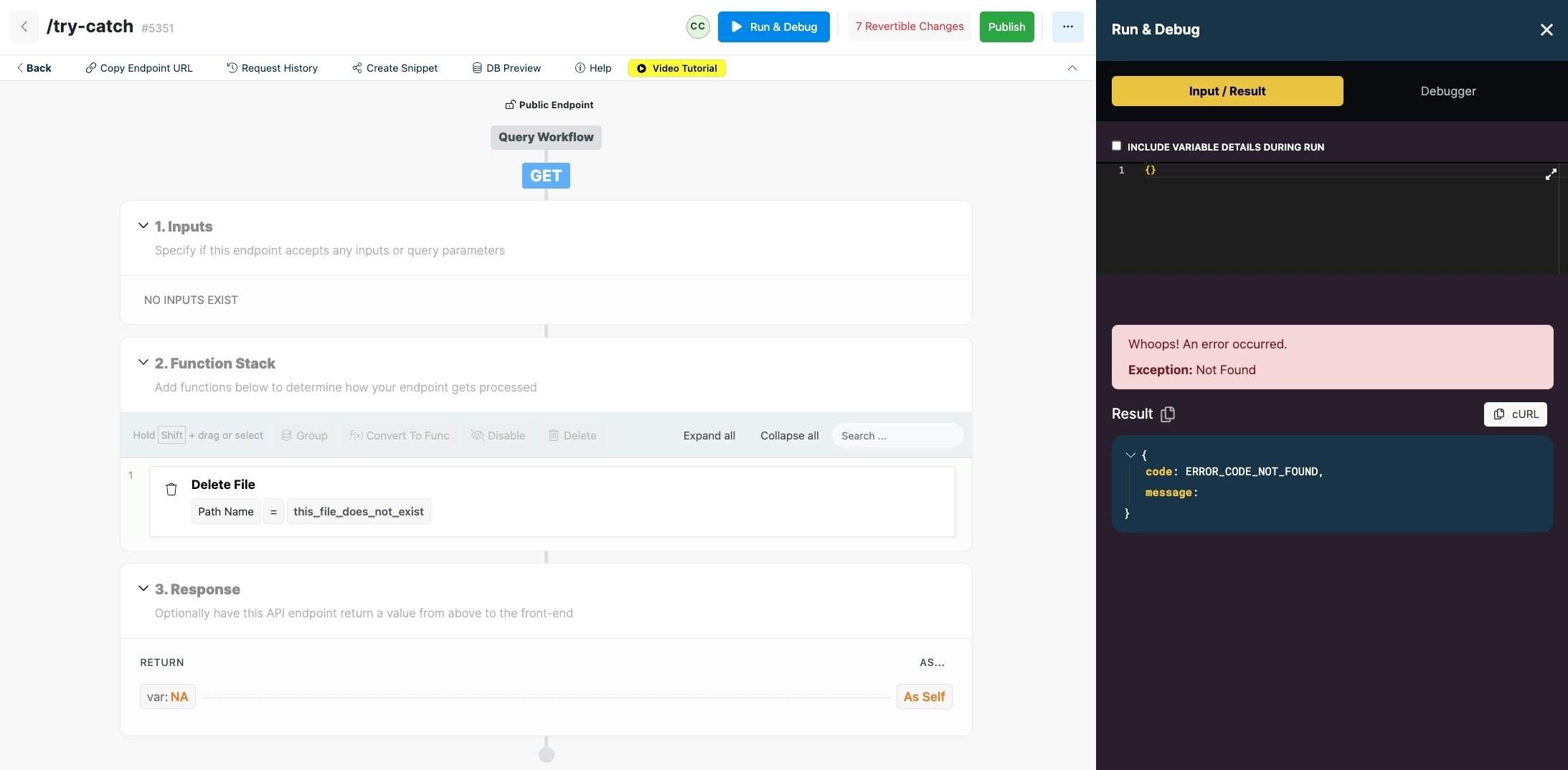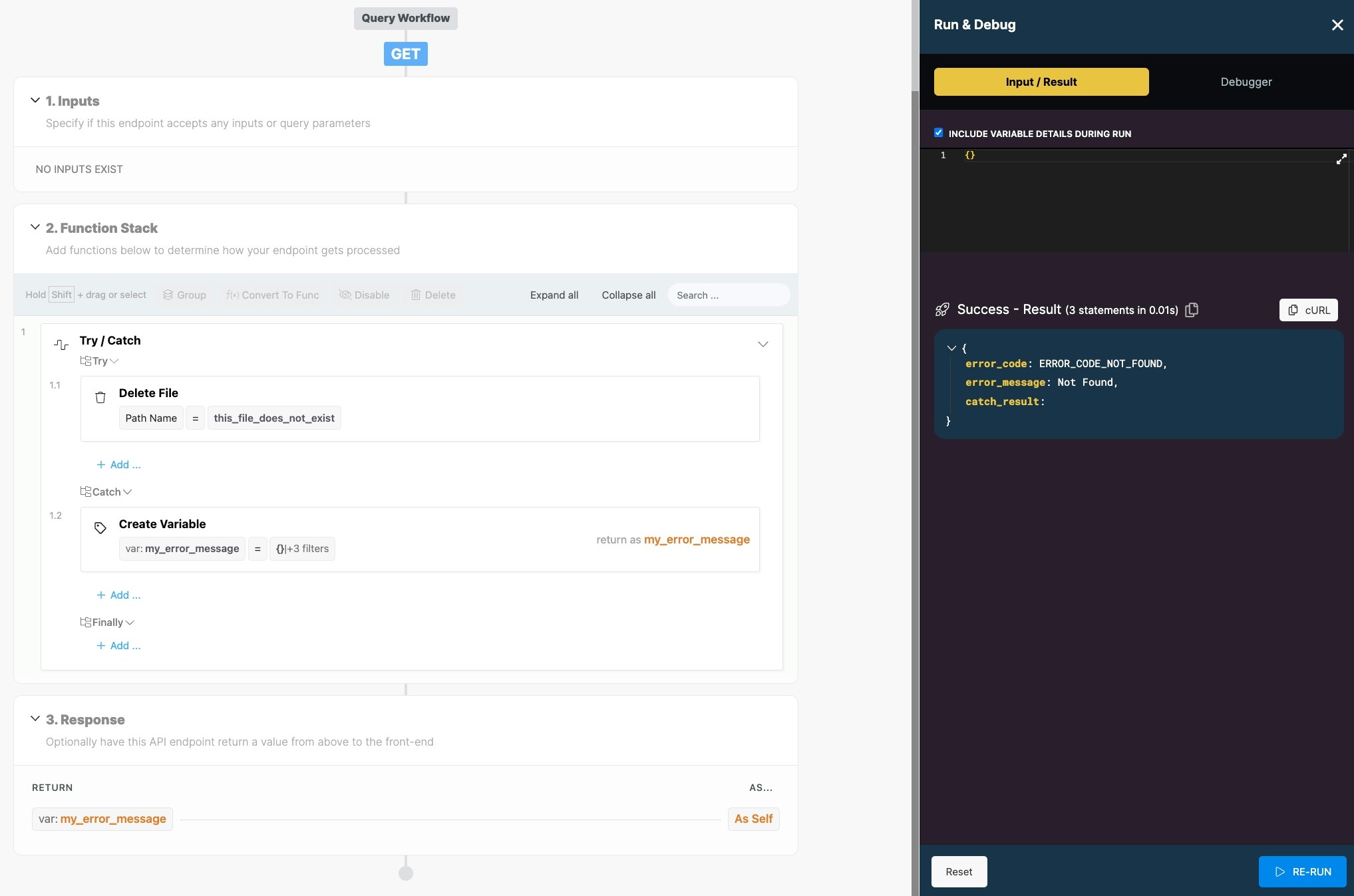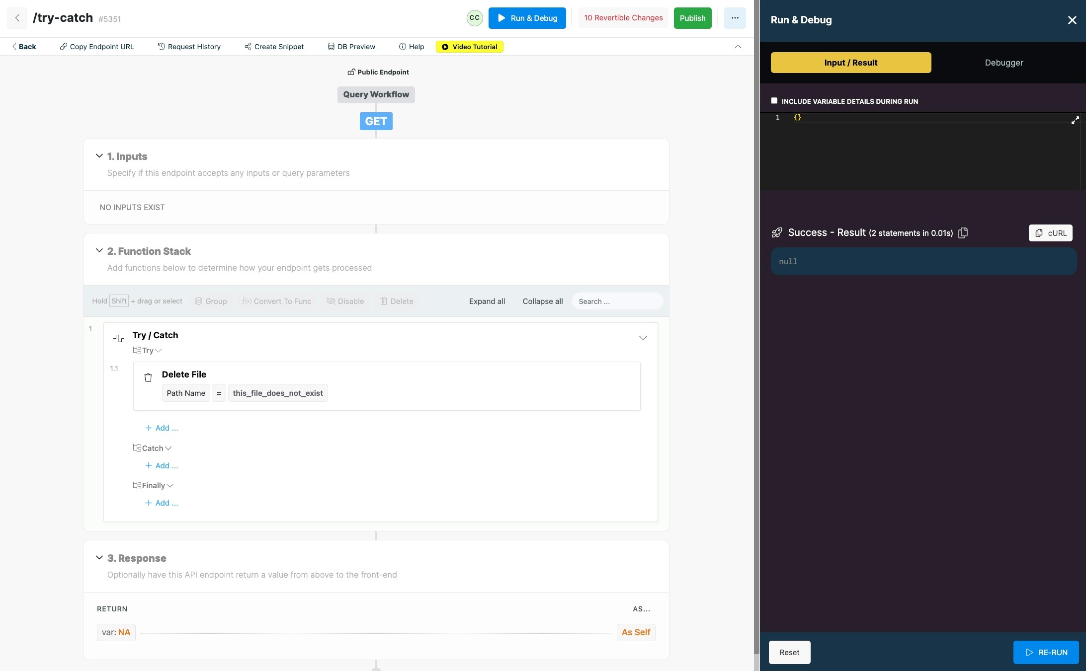 Halts execution and returns the defined result immediately. Return is useful when used in combination with conditional statements where you want to change the return based on the result of the condition.Try/Catch
