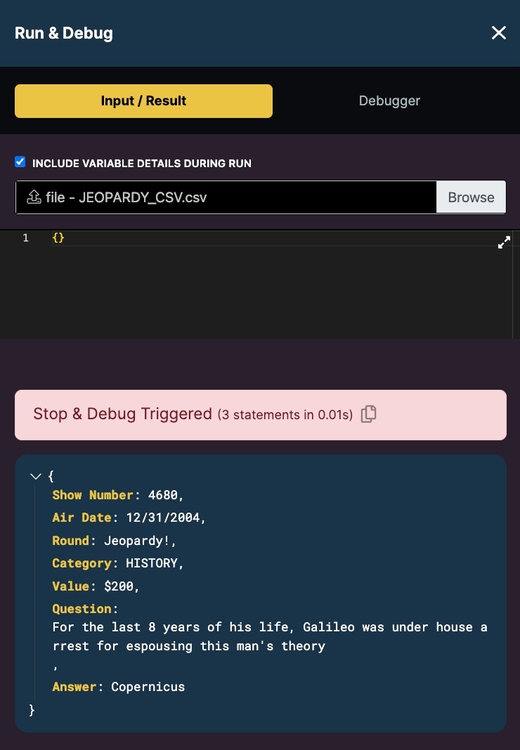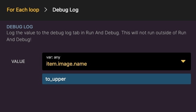 Debug Log allows you to output specific information in a new debug logging section of the Debugger. This is similar to how a console log statement in Javascript would behave. These steps will not run outside of Run & Debug.