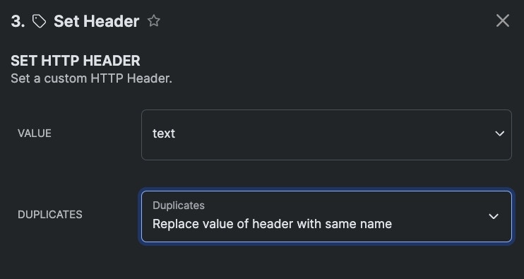 Set a custom HTTP header. This function is useful if you need your responses to deliver specific, custom headers. You can also use this to specify custom API response codes outside of the ones our Precondition function offers. The duplicates parameter lets you decide to either replace headers that already exist with your new header, or allow for duplicate headers to exist.