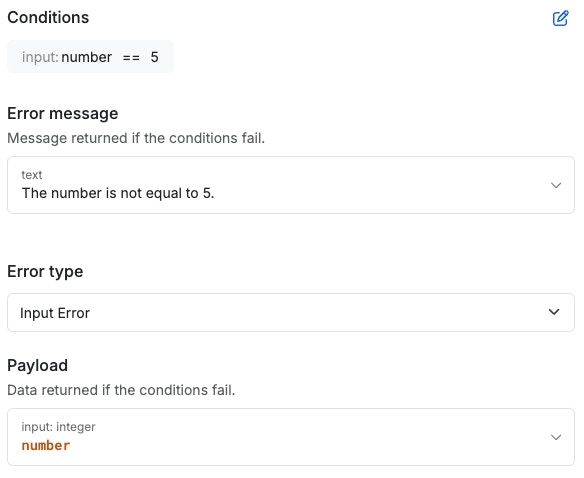 You can provide a custom error message, choose an error type, and supply a payload to return, such as the values being checked in your conditions.