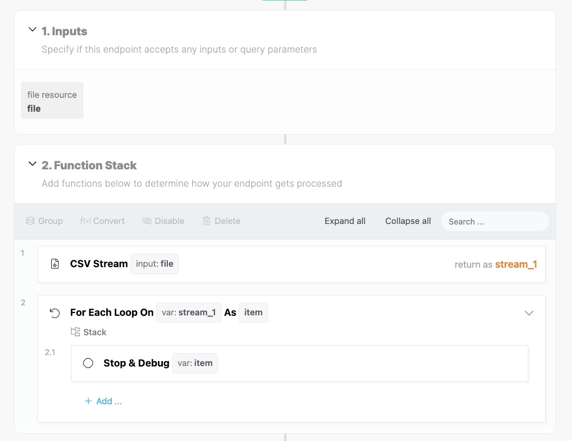 CSV Stream is a powerful function allowing you to ‘stream’ chunks of a CSV file in sequence to your function stack, allowing for processing of large CSV files.- a file resource to ingest the CSV file This can come from either a File Resource input, or a file delivered by an external API, with a Create File Resource step applied