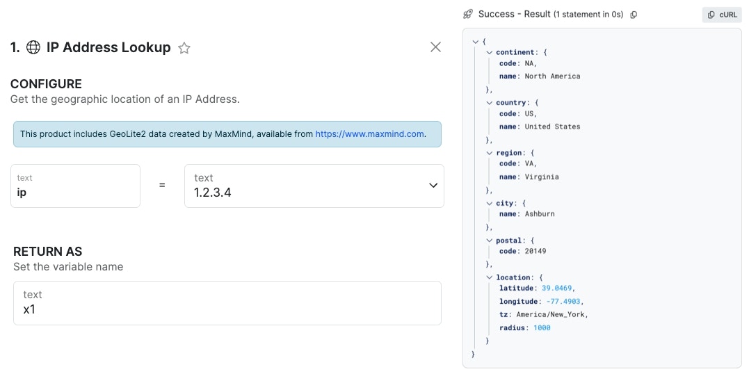 Takes in an IP address and returns geographical information based on that IP. This product includes GeoLite2 data created by MaxMind, available from https://www.maxmind.com.