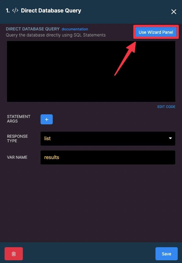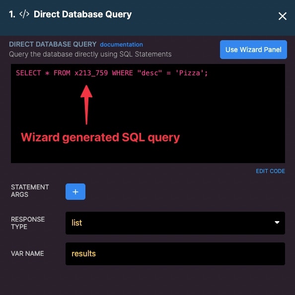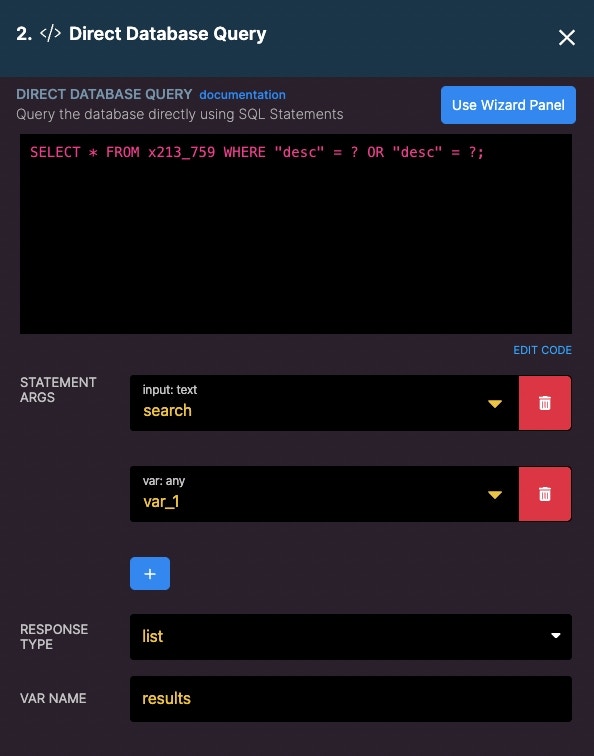 Assuming our data source is named ‘test’, mvpw599_2377 would become mvpw599_test_2377. You can replace ‘test’ in this example with the name of your data source. Direct Database Query does not respond to the selection of your data source in Xano or the data source specified in any external requests. You need to specifically state the test data source in the function. It is not possible at this time to dynamically modify the table selector.Statement Arguments