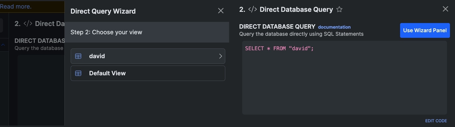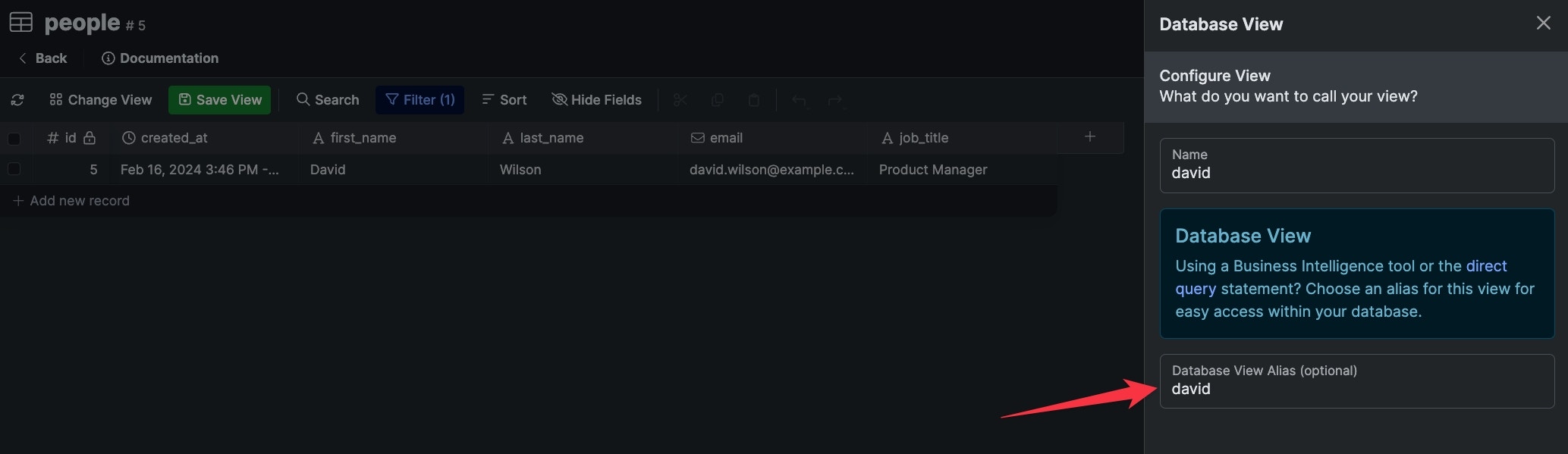 You can leverage custom view aliases to make direct database queries easier to write, and more readable, based on exactly the data that you need. Head to your database table, and create a custom view. When creating your custom view, you can provide a Database View Alias, which you can use in your Direct Database Query statement. In the screenshot below, we’ve created a database view to filter people named David in our people table. When saving the view, we’re providing an alias called ‘david’.