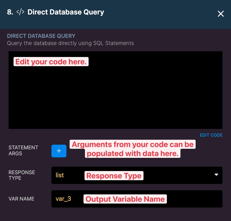 - Statement Args - If you specify arguments using **? **in your code, you can use this section to sequentially fill in those arguments with other data, such as variables or inputs previously defined in your function stack