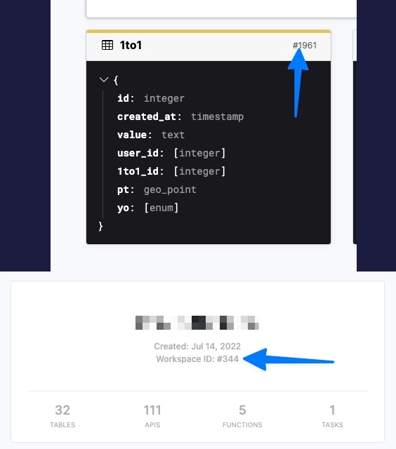 The database identifier can be found by combining the workspace ID and database table ID with ‘mvpw’. For example: If workspace ID = 1 and ID = 3:mvpw1_3