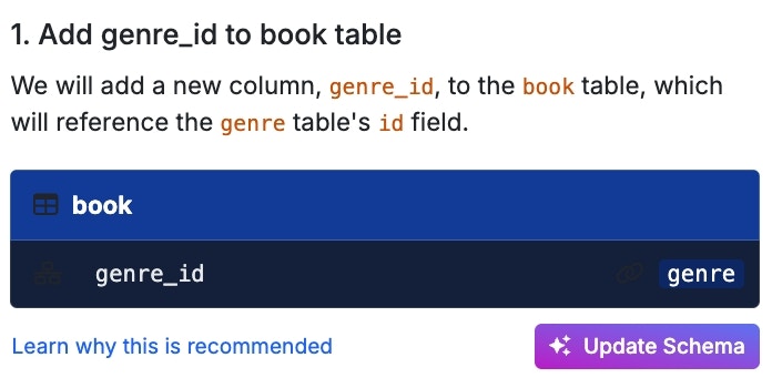 The suggestion(s) will be provided in a specific order. Step through each suggestion as you see fit and apply it by clicking Update Schema.