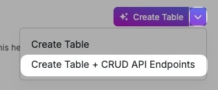 When creating database tables, the Database Assistant can create default CRUD API endpoints for you. On the Create Table step, click the dropdown to select creating CRUD API endpoints with the table.
