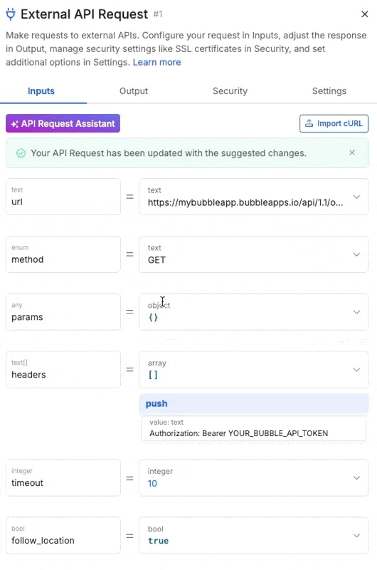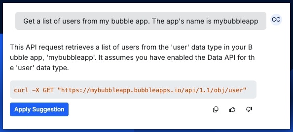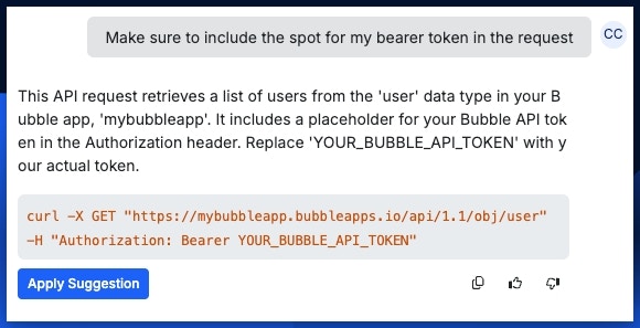 Tell the AI Assistant about the API you want to access, and any specifics about the request you want to make.
