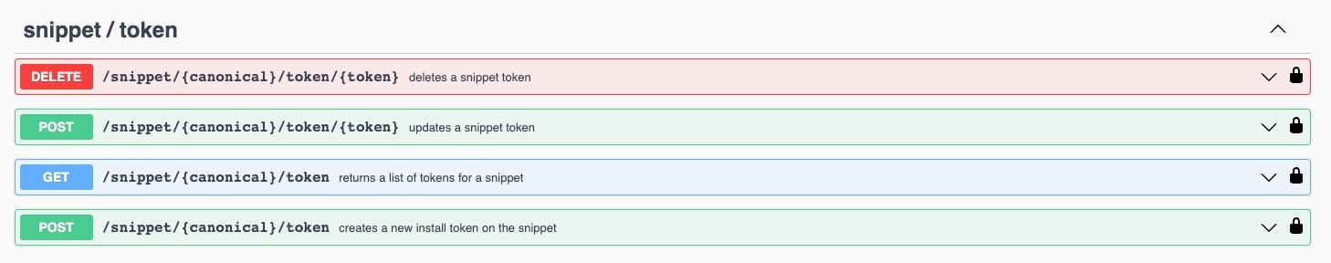 post https://app.xano.com/api:meta/snippet/{canonical}/token/{token} updates a snippet token Authentication: required Authorizations Path parameters canonicalstringRequired tokenstringRequired Body application/json max_installsinteger · int64Required current_installsinteger · int64Required Responses 200 Success! application/json Responseobject Show properties 400 Input Error. Check the request payload for issues. 403 Access denied. Additional privileges are needed access the requested resource. 404 Not Found. The requested resource does not exist. 429 Rate Limited. Too many requests. 500 Unexpected error post /snippet/{canonical}/token/{token} HTTPDELETE /snippet/{canonical}/token/{token}