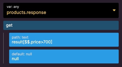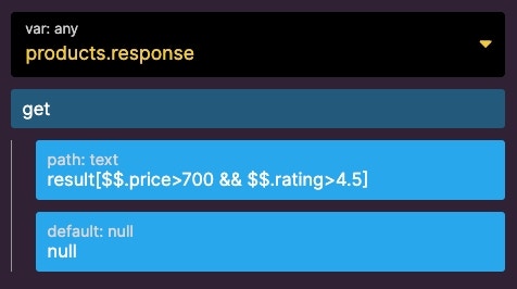 Example: items [$$.id > 1].tags[$$.weight>=90].tag
