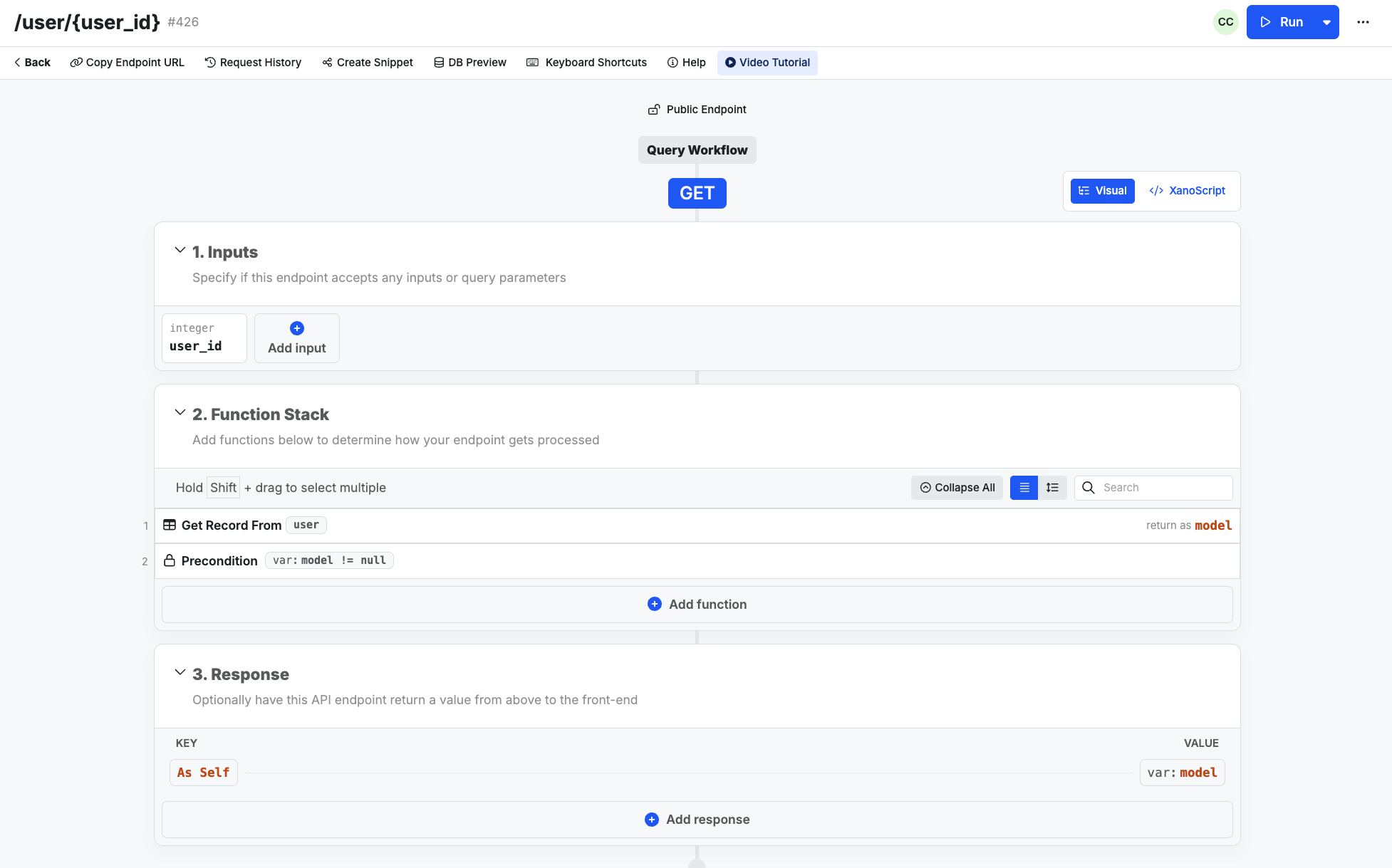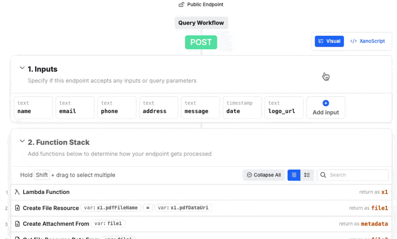 > XanoScript in the upper-right corner.Try changing some values or adding a simple function, and watch the visual builder update with the changes you’ve made. You can switch from building with XanoScript to the visual builder at any time, and always see your changes reflected.