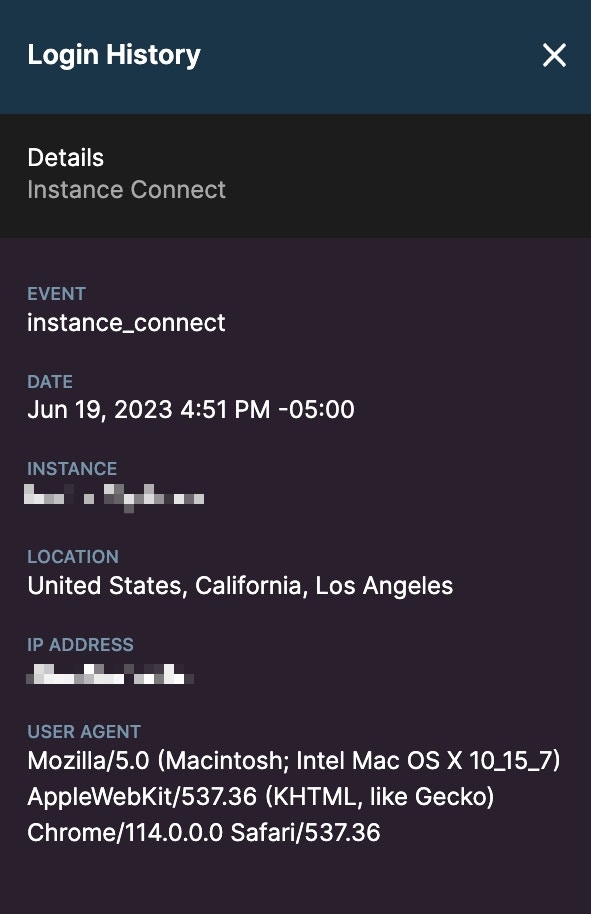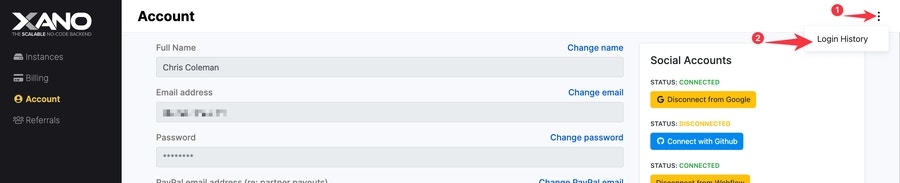 You can review previous login history for your Xano account by clicking the icon in the top-right corner of your Account page.